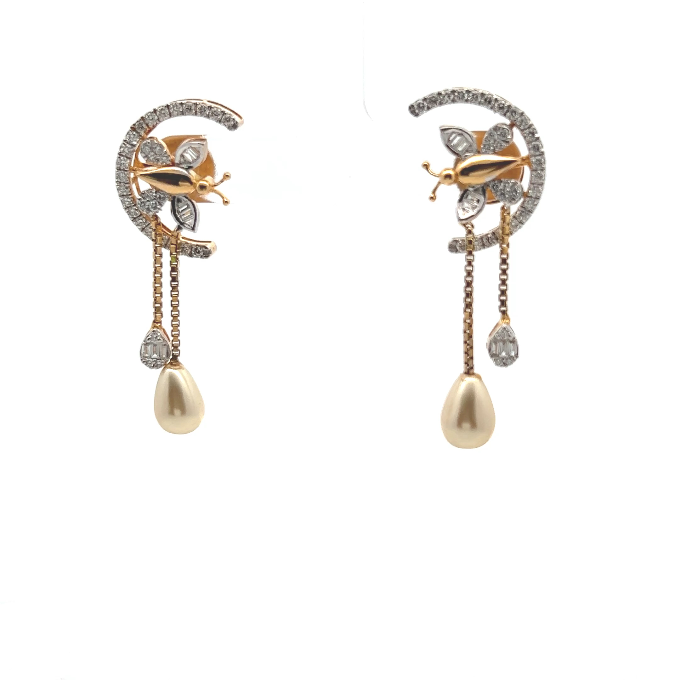 The Moonlit Blossom Earrings capture the charm of nature under a starlit sky. Crafted with a sparkling diamond-studded crescent and a graceful floral design, these earrings feature dainty chains adorned with teardrop pearls and diamonds. A perfect blend of sophistication and grace, they add timeless elegance to both festive and evening wear.
